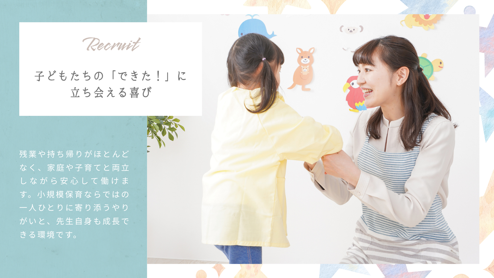 以前から保育園での調理に興味がありました。0~3歳までの小規模保育園ということで、子どもたちに寄り添って給食を作る事ができるのではないかと思い、ここで働きたいと思いました。